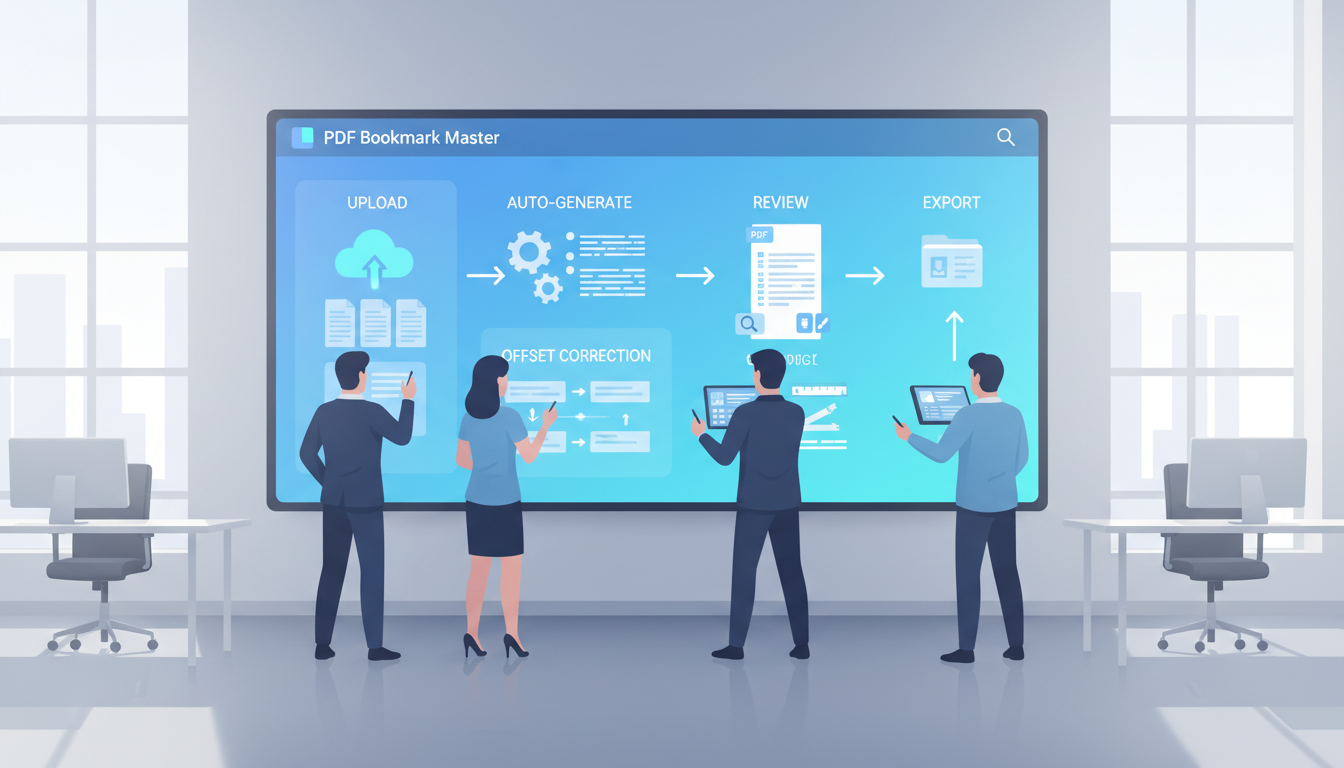 A team-ready PDF processing workflow that combines auto bookmark generation, review, offset correction, and export in one place.
